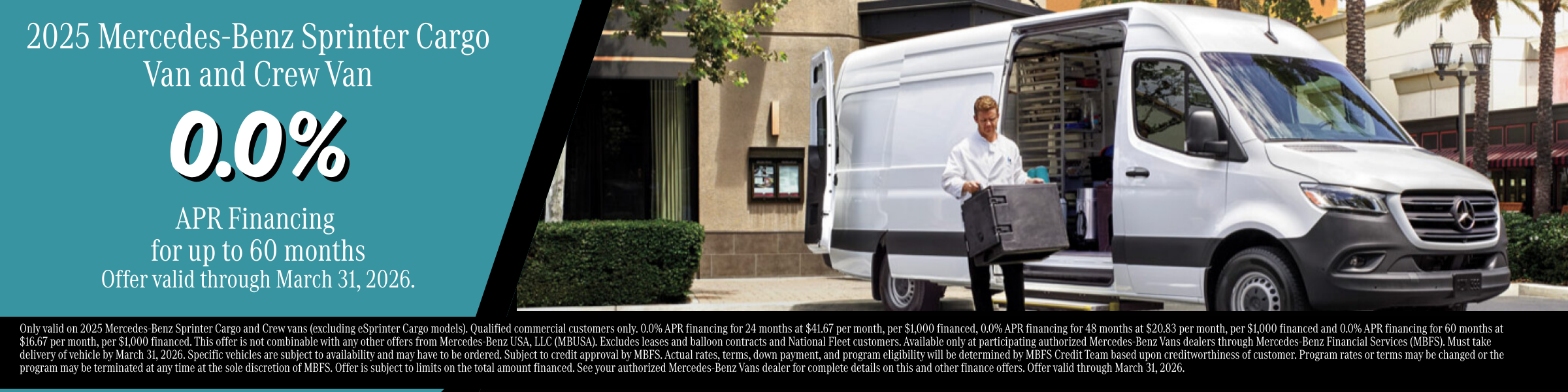 Only valid on 2025 Mercedes-Benz Sprinter Cargo and Crew vans (excluding eSprinter Cargo models). Qualified commercial customers only. 0.0% APR financing for 24 months at $41.67 per month, per $1,000 financed, 0.0% APR financing for 48 months at $20.83 per month, per $1,000 financed and 0.0% APR financing for 60 months at $16.67 per month, per $1,000 financed. This offer is not combinable with any other offers from Mercedes-Benz USA, LLC (MBUSA). Excludes leases and balloon contracts and National Fleet customers. Available only at participating authorized Mercedes-Benz Vans dealers through Mercedes-Benz Financial Services (MBFS). Must take delivery of vehicle by March 31, 2026. Specific vehicles are subject to availability and may have to be ordered. Subject to credit approval by MBFS. Actual rates, terms, down payment, and program eligibility will be determined by MBFS Credit Team based upon creditworthiness of customer. Program rates or terms may be changed or the program may be terminated at any time at the sole discretion of MBFS. Offer is subject to limits on the total amount financed. See your authorized Mercedes-Benz Vans dealer for complete details on this and other finance offers. Offer valid through March 31, 2026.